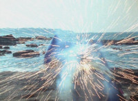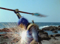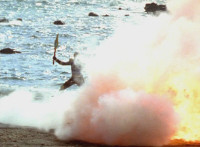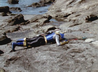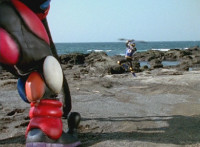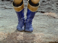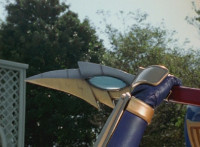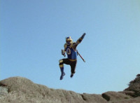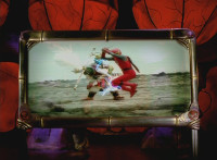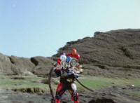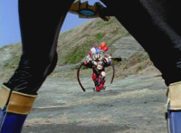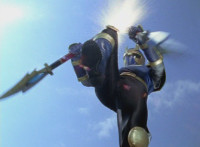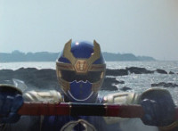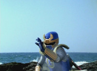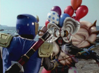 Inflatron jerks arms about, before Navy leaps forth and jabs Thunder Blade at him, but the monster whips him down. Navy lands, turns, and charges back at him, slashing him thrice, only for Inflatron to catch the fourth strike, they talk back and forth a little, then the monster breaks off by sparkily striking the Ranger, sending him falling and rolling onto the beach. |