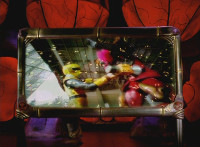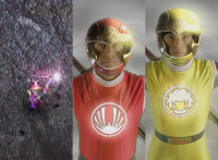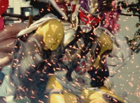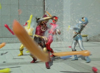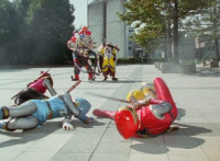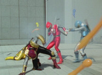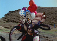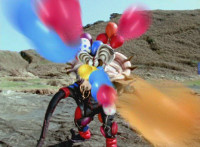 Yellow nod-talks and raises a fist, is about to rush into battle, when Red stops him, talks, then readies fist, leaps up, begins to whip out his sword, only for Inflatron to sparkily slap him with his tentacle arm until he falls and rolls over to the other Rangers. Red writhes as Blue picks him up a little and talks. Inflatron fires balloons forth at the team, sparkily floating past them until they collapse and writhe smokily. |