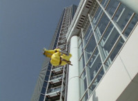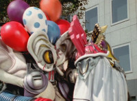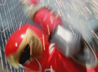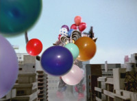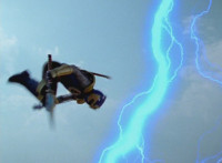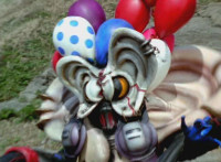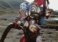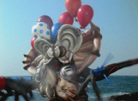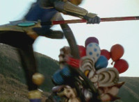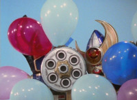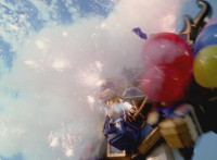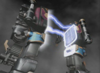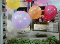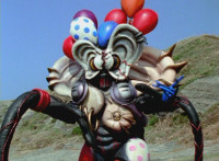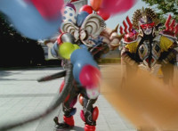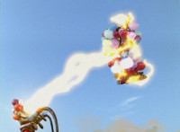 Inflatron spews balloons at Thunderstorm Megazord, which attach themselves all over its body, causing the Megazord to suddenly begin to float into the air, where Inflatron fires a bolt of energy that pops the balloons and causes the Megazord to plummet back down onto the ground harshly, spark bursting the cockpits. |