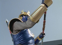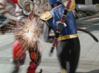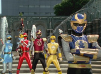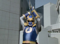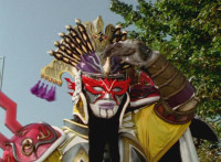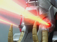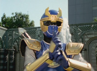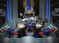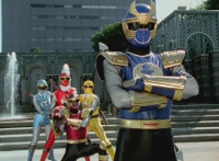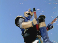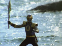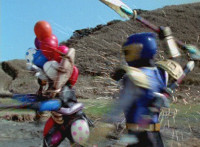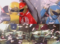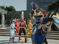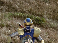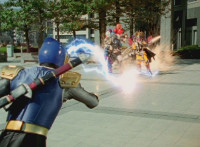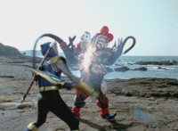 Navy jerks back and fires energy from his forehead at Shimazu & Inflatron, bursting about them. The Rangers regroup around Navy, with Red talking forth a bit. |