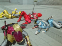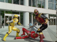 Shimazu points and laughs at the downed Rangers, as does Inflatron, who speaks, then turns suddenly. |