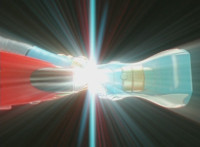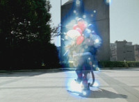 In an energy tunnel, the symbols for each of the six Ninja Storm Rangers spin around, visages of the six then appearing as they spin into one. Thunderstorm Ultrazord begins to fire its three energy beams forth (Mammothzord's eyes and Megazord's chest). |