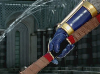 Navy rises back up, clutching his chest as he talks and finally straightens up. Inflatron continues approaching, so Navy takes his Thunder Blade, holds it up, and breaks it sparkily in half over his knee. Inflatron reacts, then Navy flings one Blade end forth. |