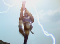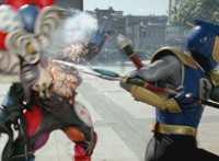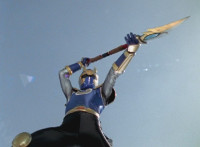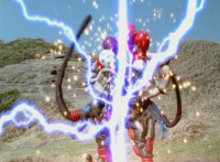 Navy poses with the other Thunder Blade end, talking, then leaps up, charges it up with blue electricity, and flips over, slashing Inflatron, causing him to flash, collapse, and explode massively. |