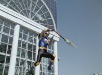 Navy leaps up and begins to slash Inflatron with his Thunder Blade sparkily. |