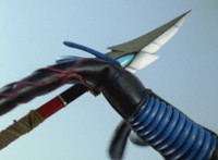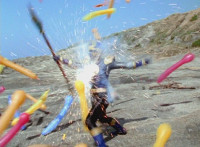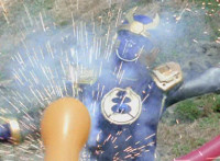Navy sparkily slashes Inflatron a few more times, and prepares to do so again. |
