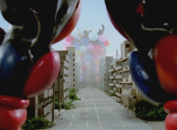 Navy gets up, twirls his Blade, charges forth, Inflatron begins to whip his tentacle arms sparkily at him until he falls and rolls again, but he quickly gets back up, Inflatron spews balloons his way, and they float past Navy sparkily. |