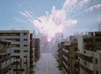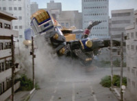 Cuts prior shot of Inflatron looking up at energy balloons; also cuts earlier battle between Rangers and Inflatron (which included Green Samurai); US replaces follow-ups of Cycle crashing into Inflatron with Cycle blasting him. |