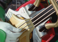 Green Samurai steps onto the corner edge of a rooftop with the Lightning Riff Blaster in hand, speaks upward and starts playing it in guitar mode. |