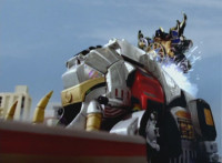 Buildings in the city shift downward, revealing the Mammothzord. |