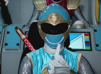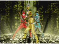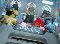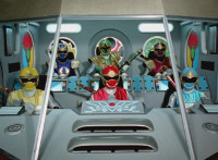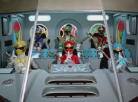 The Rangers getting sparkle-pated in the cockpit as Sensei Guinea Pig watches. |