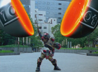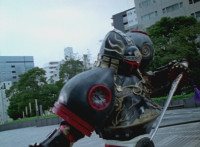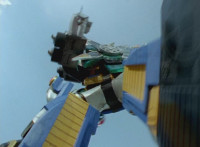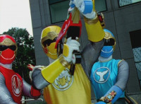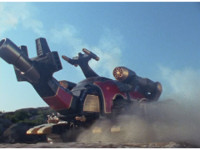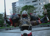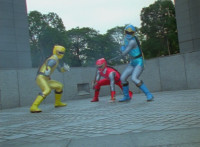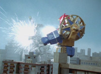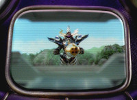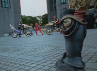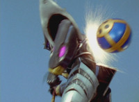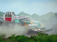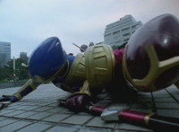 Hurricane Ultrazord drives through the city, the Megazord bopping Mammoth on top of the head, causing Power Spheres to roll out of its trunk. |