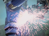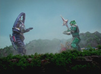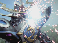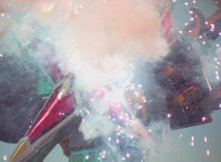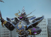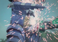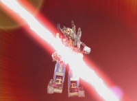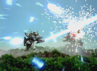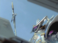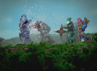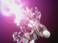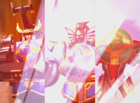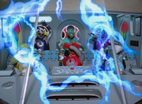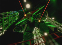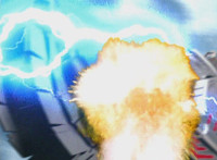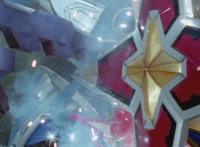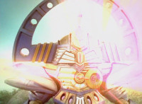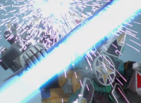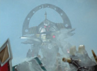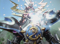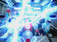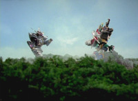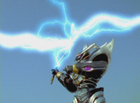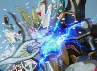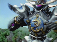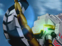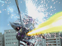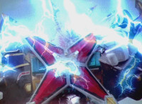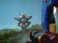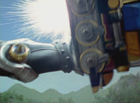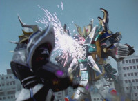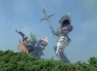 Storm & Thunder Megazords are sparkily struck by the fist missile, causing the Rangers within to writhe. Hyper Zurganezord prepares to strike with its sword, when lasers blast it sparkily, Zurgane reacting. |