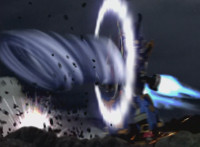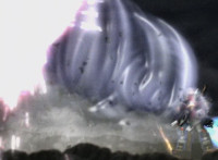 Zurganezord III writhes while being wind-blasted, Zurgane pulls out the CD from his console slot, takes it in hand and talks. Hurricane Megazord continues blowing a whirlwind at Zurganezord III, until it crackles, collapses, and explodes massively. |