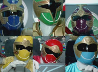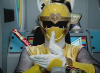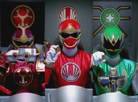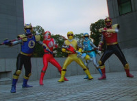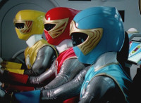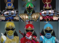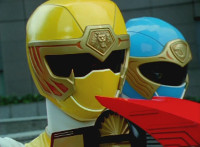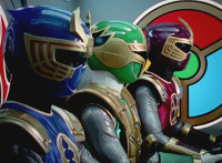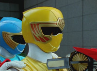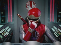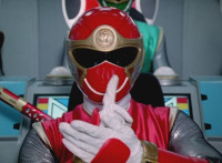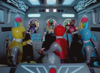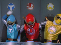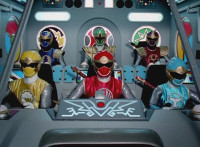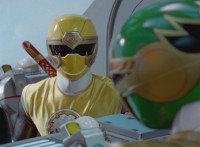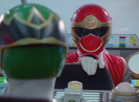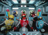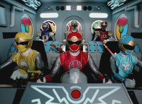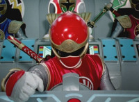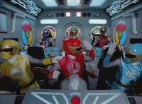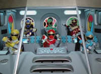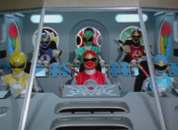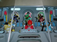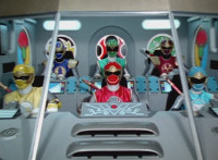 The Rangers cheer in the Hurricane cockpit, though Green Samurai is less enthused, talking a bit, Crimson replies to him, then Yellow does as well. |