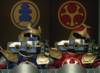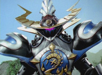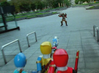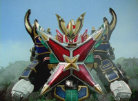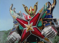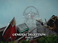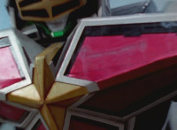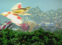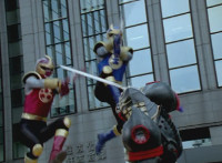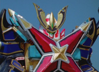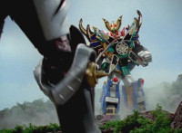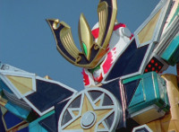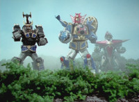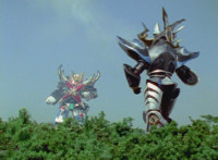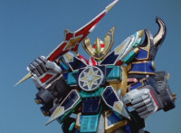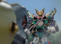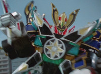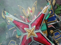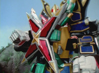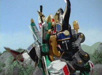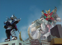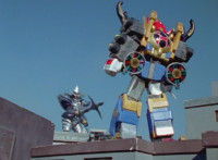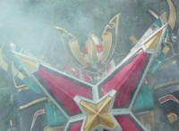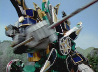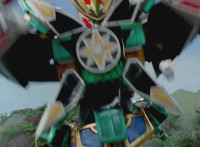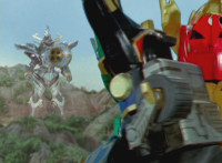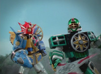 Samurai Star Megazord suddenly jolts up, Zurganezord III prepares to strike Storm Megazord, Samurai Star blocks his blade arm with his shield star weapon. Zurgane reacts, Samurai Star leaps up and sparkily kicks Zurganezord III away, giving Storm Megazord a chance to get back up. Red speaks to Green, who turns his Megazord around and addresses him with a thumb gesture. |