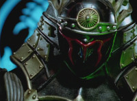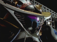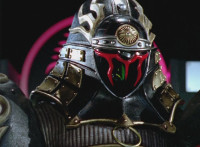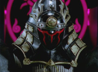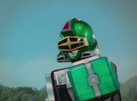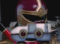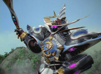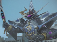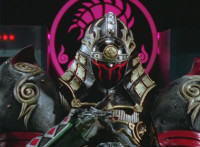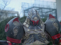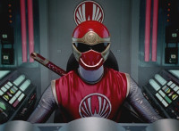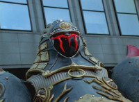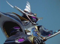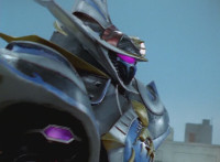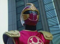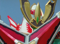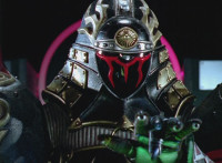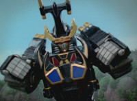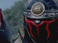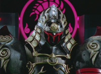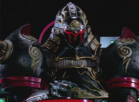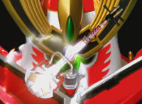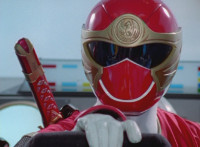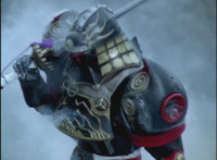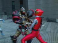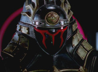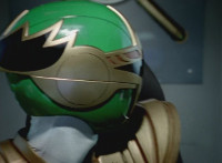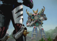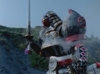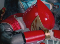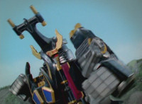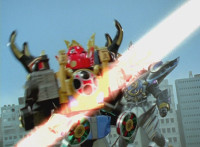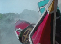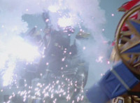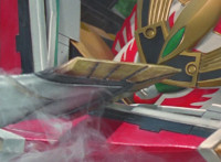 Zurgane reaches out and clenches fist, before causing Hyper Zurganezord to raise and charge its saber, motioning it about before firing forth, bursting Mammothzord. Hurricane Megazord gets up, the Rangers reacting, as Mammothzord sparks and steams. Green Samurai reacts, as does Red, Hyper Zurganezord then turning around to face Hurricane Megazord. Zoom in on Red nod-talking. |