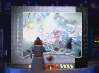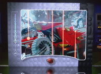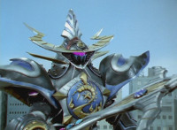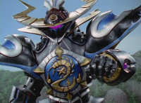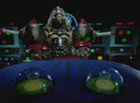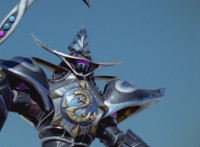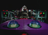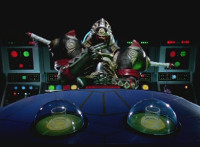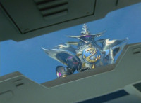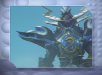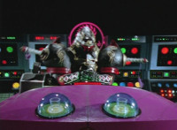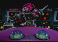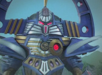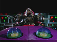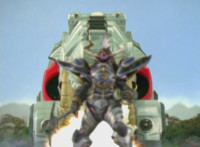 Zurgane walks into a hangar, stops and looks upward at Hyper Zurganezord, which stands before him. Zurgane inserts the CD into the console slot, turning it on, then he sits down in the cockpit, touches the disc-slot device next to him and talks, before grabbing the control stick, raising the Zord's arms. |