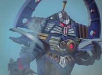 Hyper Zurganezord faces Storm & Thunder Megazords, Zurgane gripping controls with both hands. |
