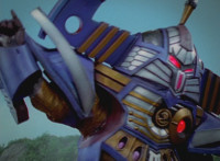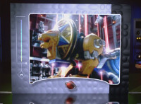 Hurricane Megazord grimaces as an image of the Lightning Riff Blaster pulsates before its face. Mammothzord's eyes glow to life. |