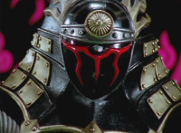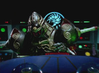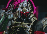 Crimson, Red, and Green Samurai lock and drop their Power Discs. Zurganezord III recovers, Zurgane presses a button, and the chest scanner activates, scanning as Power Spheres 17, 16, & 15 are released by the Megazords. Zurgane gets a chuckle out of whatever he's doing. |