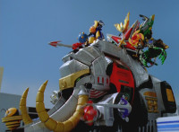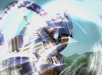 Hyper Zurganezord begins to downstroke its saber, when Mammothzord shoots a Power Sphere at its back, Zurgane getting shaken up. |