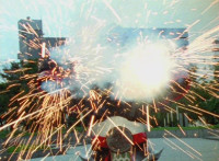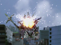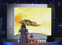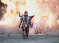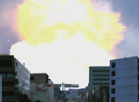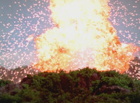 Altered to fit monitor; cuts before more explosions erupt; cuts nearby follow-up of Hyper Zurganezord standing amid flames. |
