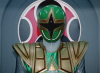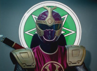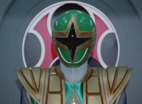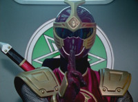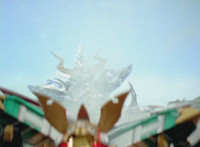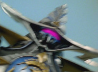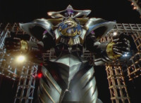 In midair, Hurricane Megazord slashes its saber forth, repeated three times with energy swirling about. Hyper Zurganezord takes the blow and shrugs it off, Hurricane Megazord lands and faces it. Zurgane pulls out his Power Disc and inserts it in the slot, before pulling the lever to drop it. A Power Sphere pops out of Hyper Zurganezord's chest and spins before it. Each Ranger reacts individually, Zurgane then speaking and pointing forth, as the Rangers look on stunned. |