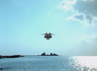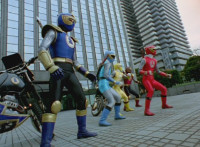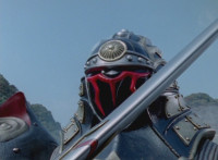 Green Samurai speaks a little, then Navy responds, before Green Samurai talks some more, Blue then speaking to him briefly. Red also talks to Green Samurai, who replies with a salute, then Red replying again. Samurai Star Chopper flies over the camera toward an island. |