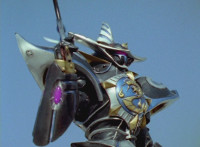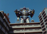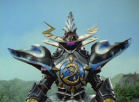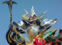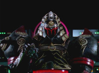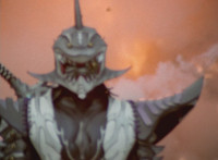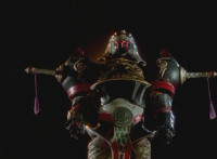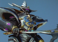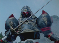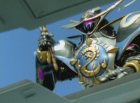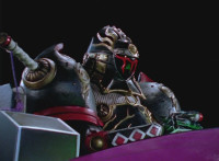 Hyper Zurganezord approaches the downed, smoking Hurricane Megazord, the Rangers dazed in the cockpit, Zurgane motions his hand in anticipation, as his Zord points its sword downward at the Megazord. Zurgane grabs the controls, Hyper Zurganezord lifts the saber high and holds it there for dramatic tension, Red reacting. |