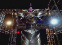 Samurai Star Megazord gets laser-repaired as it stands in hangar. |