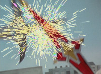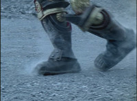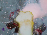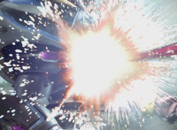 Cuts shot of Crimson's boots leaping up between shots 1 & 2; US replaces follow-up of the three bursting. |