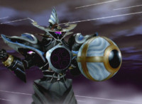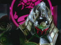 Zurgane inserts his disc it in the slot, before pulling the lever to drop it. A Power Sphere pops out of Hyper Zurganezord's chest and spins before it. |