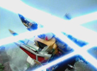 Hyper Zurganezord turns around to see the three Winds riding their Ninja Gliders above the Thunders on their Tsunami Cycles. Red flies his Glider, Zurgane speaks, the Thunders leap their Cycles over the camera, as they hop up and smash into Hyper Zurganezord, the Ninja Gliders also strafing the Zord with minor sparkage. |
