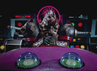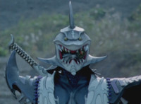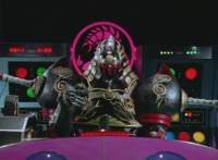 Zurgane reacts, facing the downed Rangers he punches his fist to palm, then leaps up and once back in Hyper Zurganezord, clenches his hands together for a moment, before gripping controls, causing the Zord's eyes to light up. |