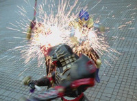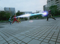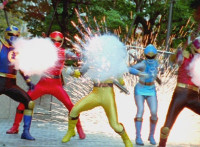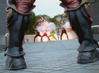 Zurgane crosses his swords upward, Yellow talks before lowering Storm Striker, causing the 100 ton weight to fall upon Zurgane, who cuts it in half with ease, the pieces exploding around him, as he poses with his sword. The Winds react, the Thunders regrouping with them, Crimson then speaking. Zurgane tosses his swords into the air, aims his hands forth and fires bursts from his fingertips at the five Rangers, spark bursting them. |