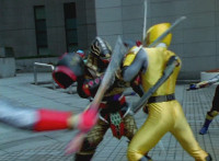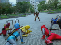 Continued, Yellow falls, Zurgane turns and sparkily slashes Crimson, Blue, Navy, and blocks Red's attack then jabs at him. |