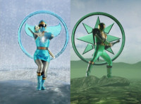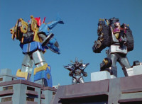 On the left, Storm Megazord formation sequence. On the right, Thunder Megazord formation sequence. |