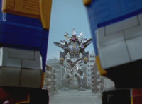 Zurganezord III slowly approaches the downed and smoking Megazords. |
