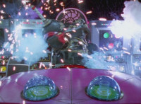 Altered to fit monitor; cuts follow-ups of Chopper crashing and Megazord falling to pieces. |