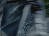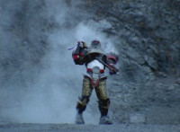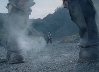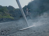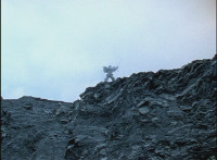 Body smoking, Zurgane staggers through a quarry, until he reaches a cliff, where he stands talking. |