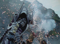 Final shot fades to black; cuts follow-up of Vexacus walking away from sword in ground and flaming debris. |