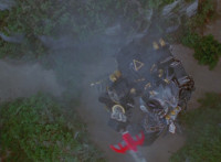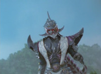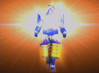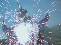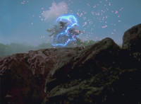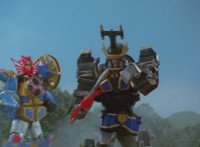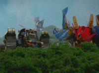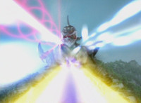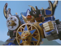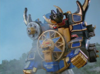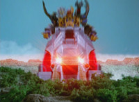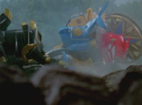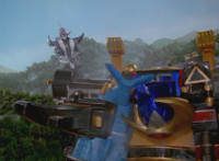 Thunderstorm Megazord lands in Mammothzord's back, forming the Thunderstorm Ultrazord as they roll through the forest. In an energy tunnel, the symbols for each of the five Ninja Storm Rangers spin around, visages of the five then appearing as they spin into one. Thunderstorm Ultrazord begins to fire its three energy beams forth (Mammothzord's eyes and Megazord's chest). Vexacus is struck, explodes, but nope, he's okay, and rides his landshark straight forth into Thunderstorm Ultrazord, exploding it, sending the Storm & Thunder Megazords flying out and onto the ground side by side, sparkiling the cockpits. |