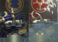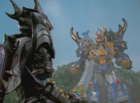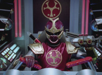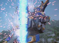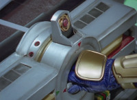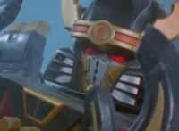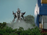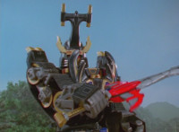 Vexacus laughs as he faces away from the two downed Megazords. Storm Megazord, and then Thunder Megazord, get back up. Crimson slides his HUD aside and talks in his cockpit, as does Navy. |
