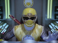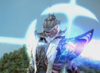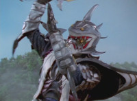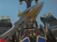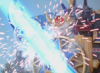 Navy inserts a Power Disc and pulls the lever. Power Sphere 01 pops out of Thunder Megazord and hatches into Serpent Sword, which it wields and charges into battle with as Storm Megazord watches incredulously. Vexacus turns and looks just as Thunder comes over, sparkily slashes him, then leaps up and flips over him, and grabs him from behind. Storm Megazord reacts stunned. |
