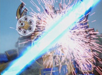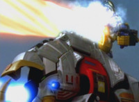 Thunderstorm Megazord pulls the cord through its Lion chest, firing energy from its chest, back-cannon, and shoulder gatling. |
