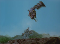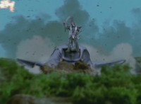 Second shot is a single frame artifact of the blade cutting through Thunder's back; US replaces wide shot of two impaled with Vexacus back-bashing Thunder instead. |