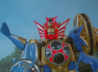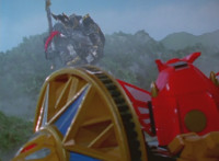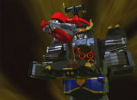 Thunderstorm Megazord rolls forth on its treaded feet. |