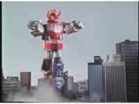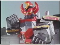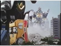Megazord gets sparkily struck by Dragonzord's drill tail tip, causing it to burst off. |