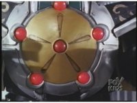Close on Dragonzord's chest plate as the five surrounding red lights blink rapidly. |